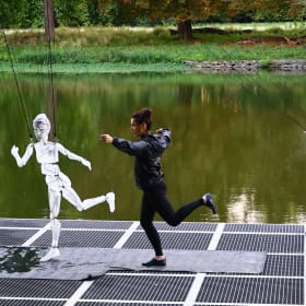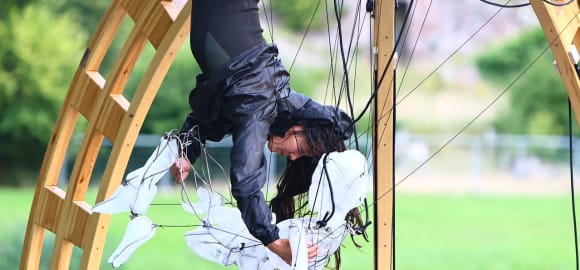 Born from their encounter, this creation merges their approaches to material and storytelling—through dance, circus arts, and puppetry. For Satchie Noro, the show continues her poetic exploration of movement in non-traditional spaces—architectural apparatuses—while for Élise Vigneron, it extends a decade-long investigation into ice and remote puppet manipulation.