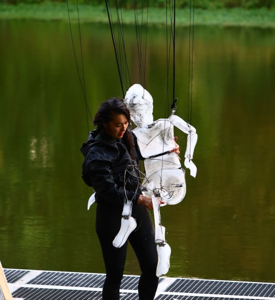 It is a landscape piece on water, a pas de trois performed by a dancer, an ice puppet, and her puppeteer. A tale of suspension, metamorphosis, ephemerality, and mirrors.