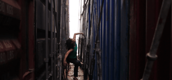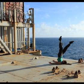 The film documents danced improvisations all around the cargo during these 42 days at sea. A dance of metamorphosis that Satchie Noro filmed herself.